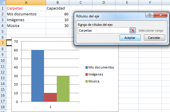 - Luego con el curso en el segundo campo ("Valores de la serie") borraremos previamente la opción que aparece por defecto, y daremos clic en la celda que será el otro eje de la gráfica (eje vertical), en mi caso B2 y clic en "Aceptar".