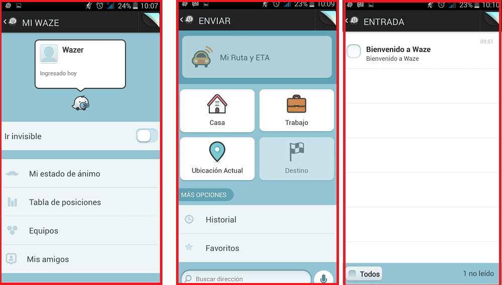 Opción "Entrada": Te da la bienvenida al Waze, puedes ver las rutas que te ha enviado un amigo, en sentido general es la bandeja de entrada de los mensajes de Waze.